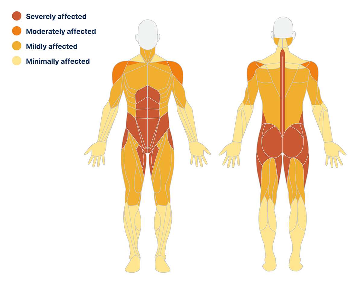 Muscle weakness is usually greatest proximally and impacts the lower extremities more than the upper extremities.8 The abdominal muscles, paraspinal muscles (with exception of the neck extensors and neck flexors), hip flexors, hip extensors, hip adductors and hip abductors are the most severely affected in late-onset Pompe disease, as shown in the diagram below.9