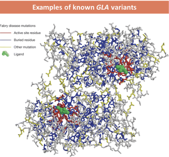 Many of the GLA mutations seen in patients with Fabry disease involve the hydrophobic core of the α-Gal A dimer, not just the active site. This suggests Fabry disease is primarily a condition of abnormal protein folding. This diagram illustrates the location of many of the known mutations. Changes to the active site are coloured red, the core of the enzyme in blue and other changes in yellow. The green ligand indicates the location of the active site.4