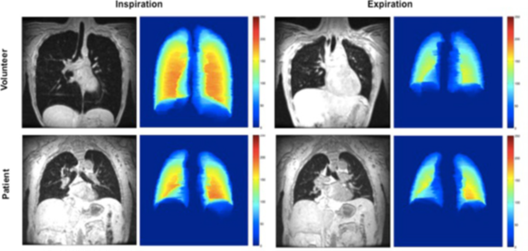 Below, we see coronal slices through the carina for MRI breath-hold scans with the corresponding colour plots of a late-onset Pompe disease patient and a volunteer. Note the lack of diaphragm displacement in the Pompe disease patient. The colour maps represent the thickness of the segmentation in the anterior-posterior axis (red being the thickest and blue being the thinnest).10