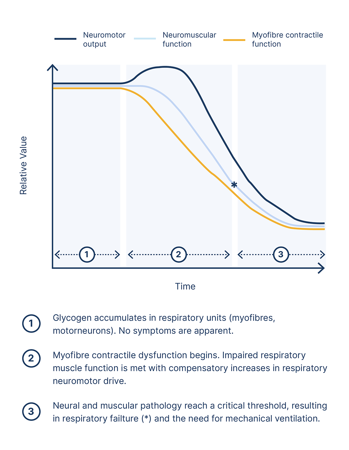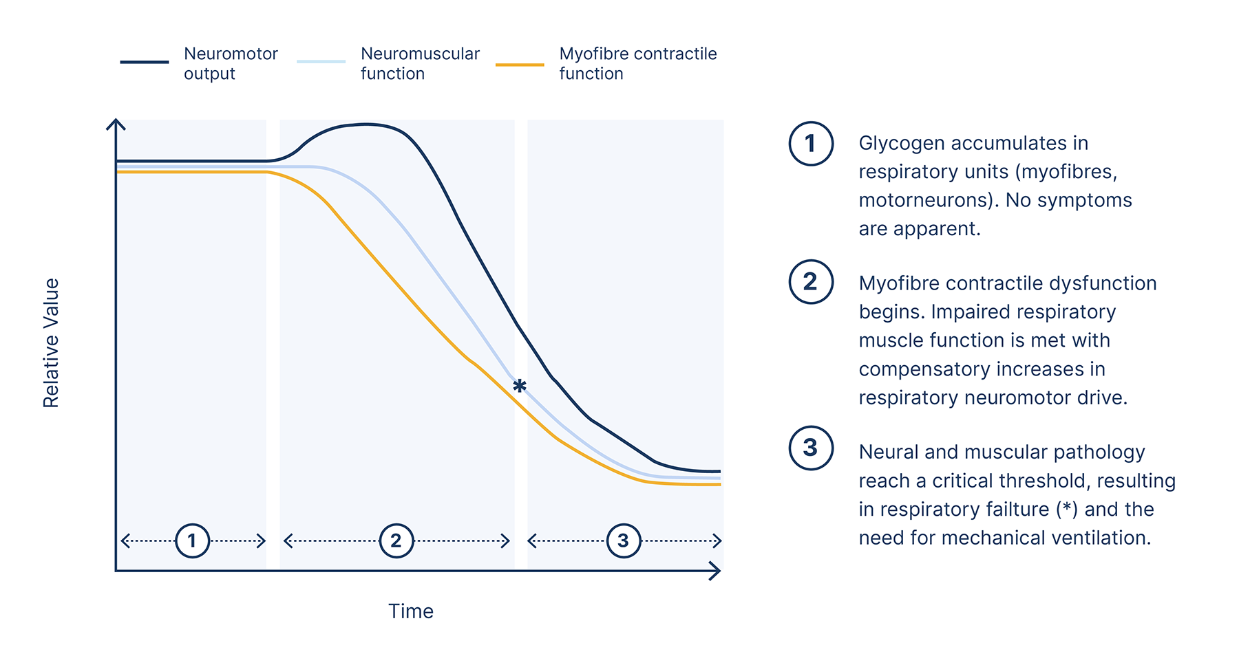 This graph summarises one proposed model of the relationship between declines in muscular and neural function, and the associated impact on respiratory capabilities.6